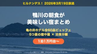 2026年3月19日放送の「ヒルナンデス」で、千葉県鴨川市の「朝食が美味しい宿」が特集されました。榊原郁恵さん・浮所飛貴さん(ACEes)・バッテリィズが「泊食分離」の新トレンドに注目し、1泊朝食付き1万円台から泊まれるリニューアルホテルや...