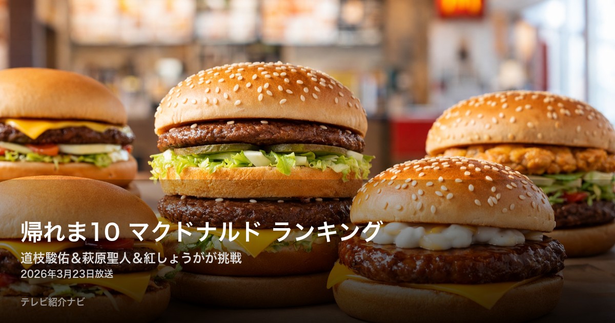 2026年3月23日放送の「帰れマンデー見っけ隊!!」3時間SPで、マクドナルドの帰れま10が実施されました。タカトシ&サンドのMC揃い踏みのもと、萩原聖人・なにわ男子 道枝駿佑・紅しょうがが挑戦。人気メニューベスト10の結果をまとめます。