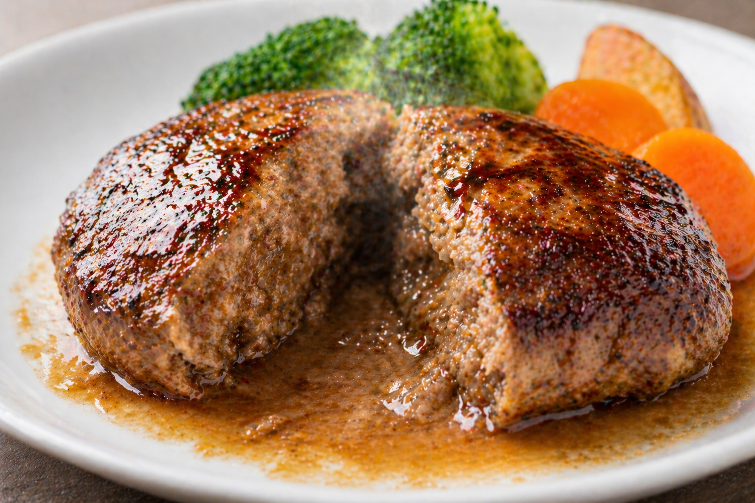 「一口頬張れば肉汁が湧き水のごとく口の中に溢れます」——リュウジさんが渾身の思いを込めた至高のハンバーグは、再生数1,016万回の大人気レシピ。粉ゼラチンと牛脂を加えるという独自技法で、家庭のフライパンでお店級のジューシーさを再現します。