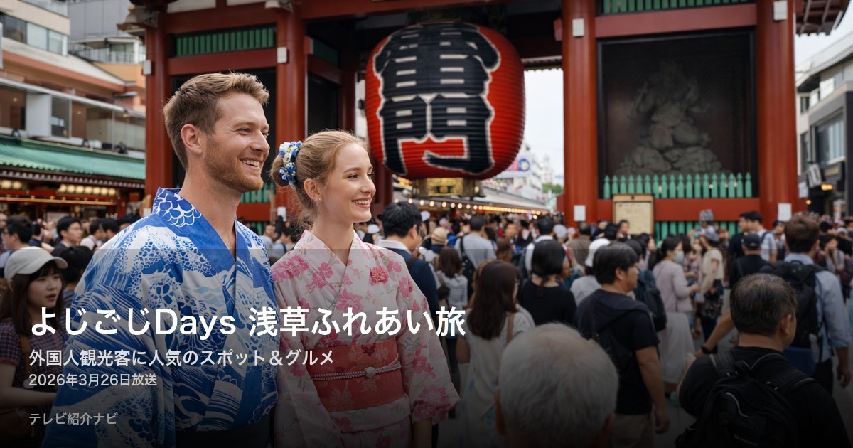 2026年3月26日放送の「よじごじDays」で、外国人観光客とふれあい旅in浅草が特集されます。MC小泉孝太郎が浅草を巡り、外国人に人気のスポット・グルメ・体験を紹介。浅草で行くべき場所をまとめます。