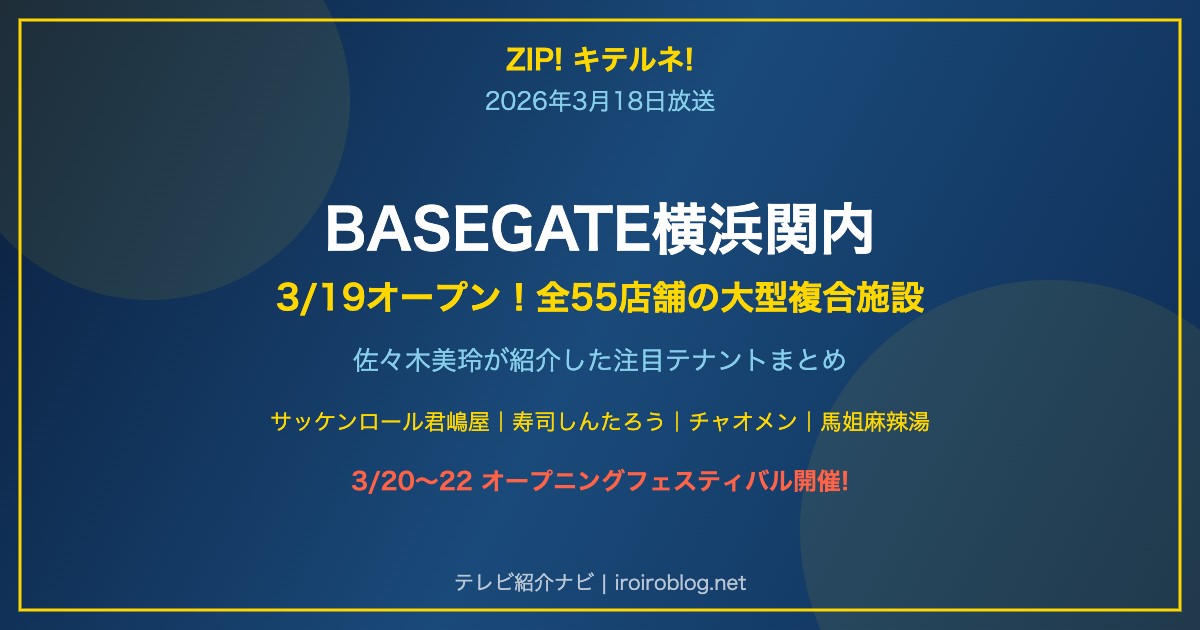 2026年3月18日放送ZIP!キテルネで佐々木美玲さんがBASEGATE横浜関内をレポート。JR関内駅徒歩1分の旧市庁舎跡地に全55テナントが集結する大規模複合施設で、3月19日グランドオープンです。